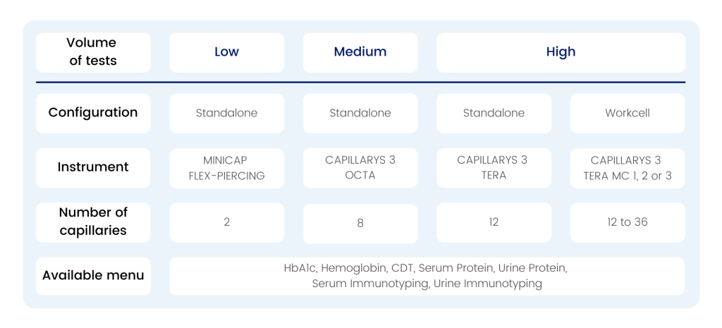 The Sebia capillary electrophoresis instruments are equipped with several parallel capillaries enabling multiple simultaneous analyses and scalable throughput: